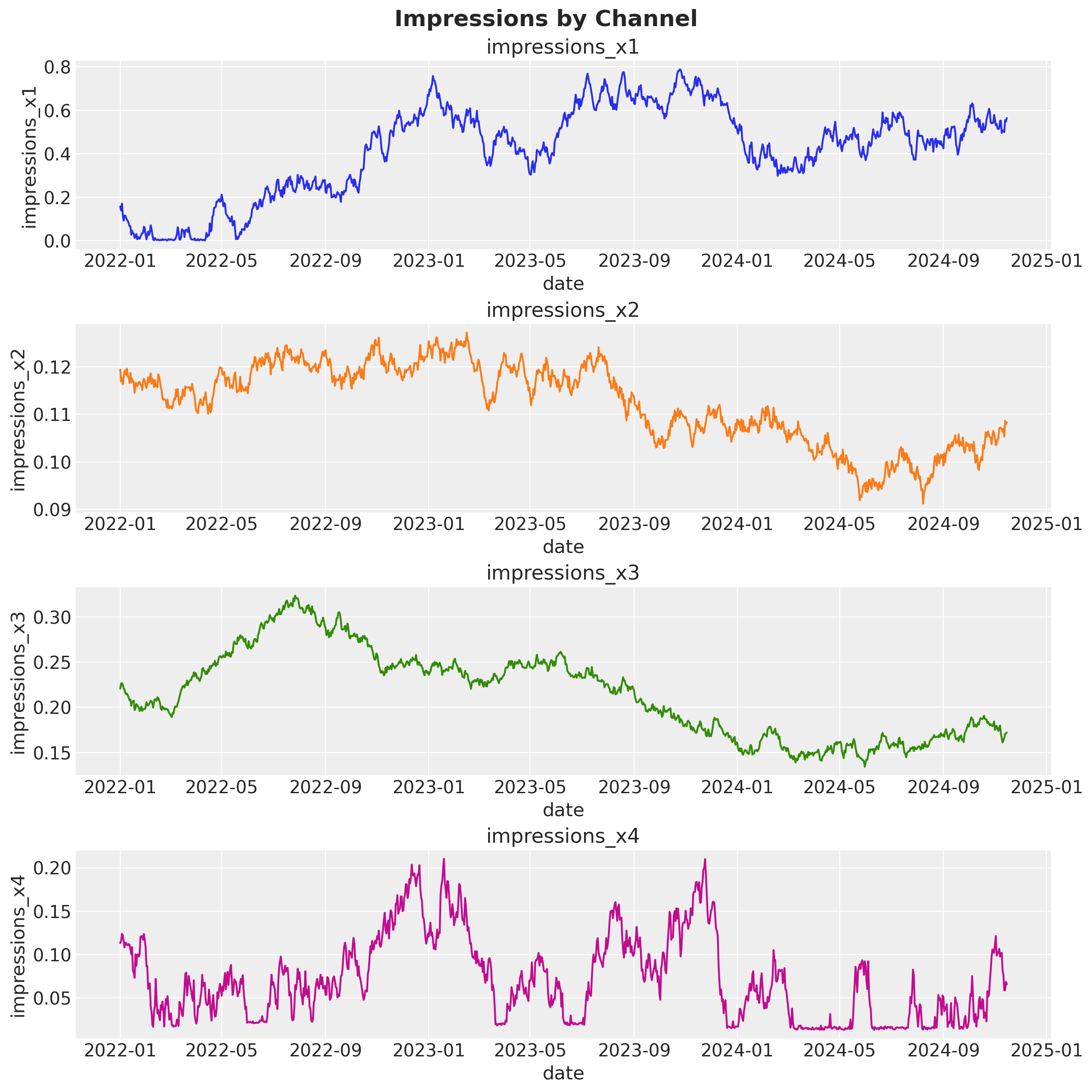 • We have 4 upper-funnel channels: impressions_x1, impressions_x2, impressions_x3, impressions_x4.