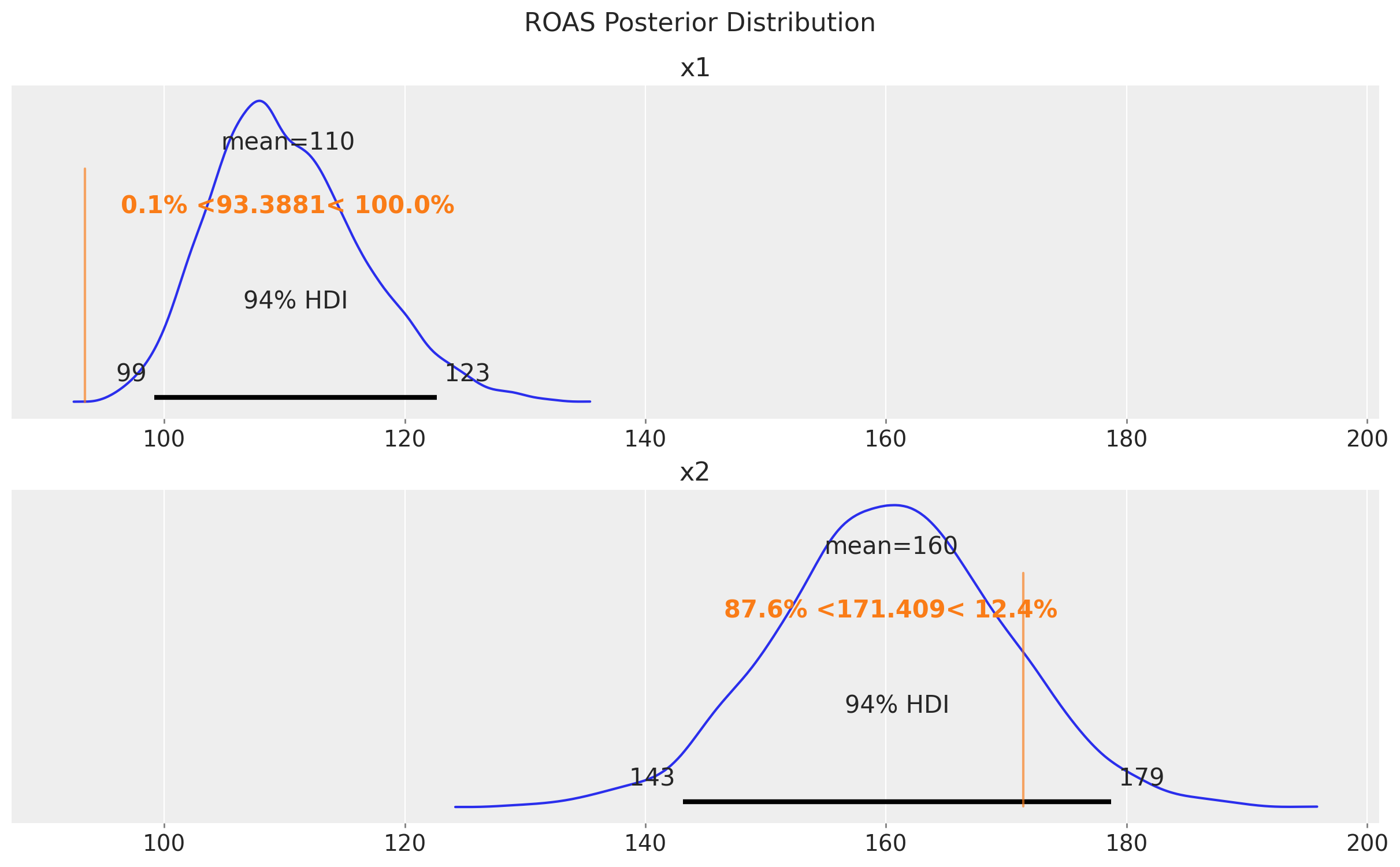 Finally, let’s compute the ROAS for the x1 and x2 channels.